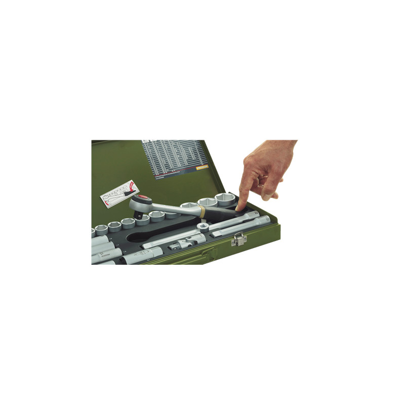 Compact socket and ratchet set in a sturdy metal case The set includes heads in sizes 6-24 mm |