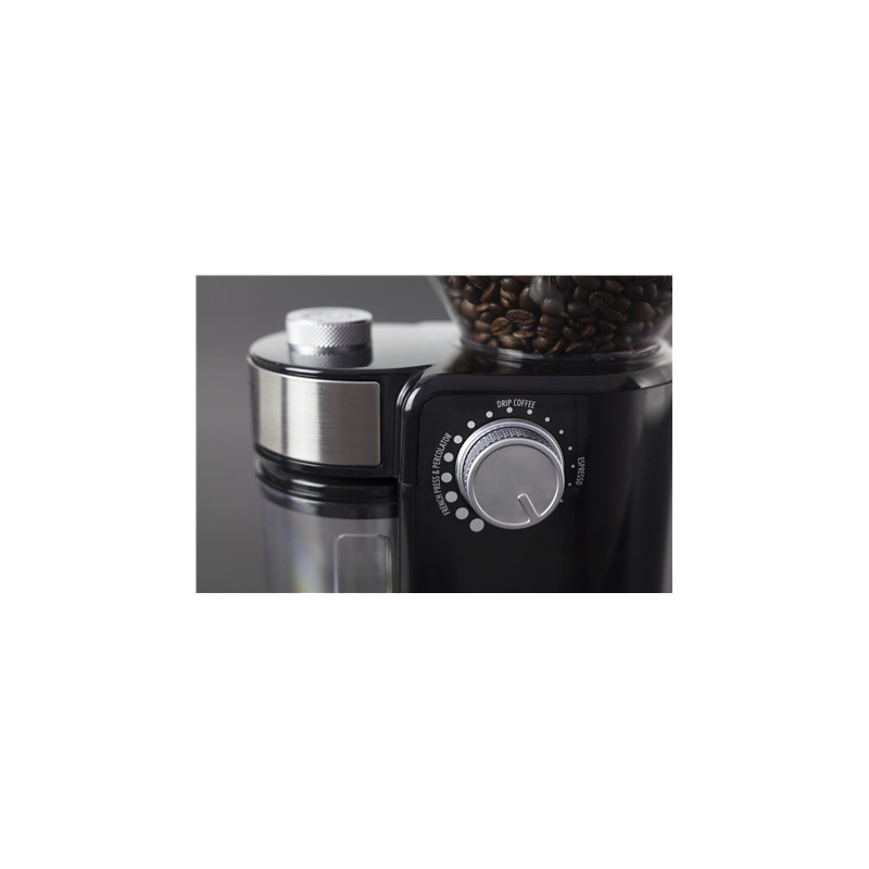 string(171) "Slow, aroma friendly grinding through disc grinder. Removable bean container. Grind level can be adjusted individually from coarse to fine for perfect espresso and coffee."