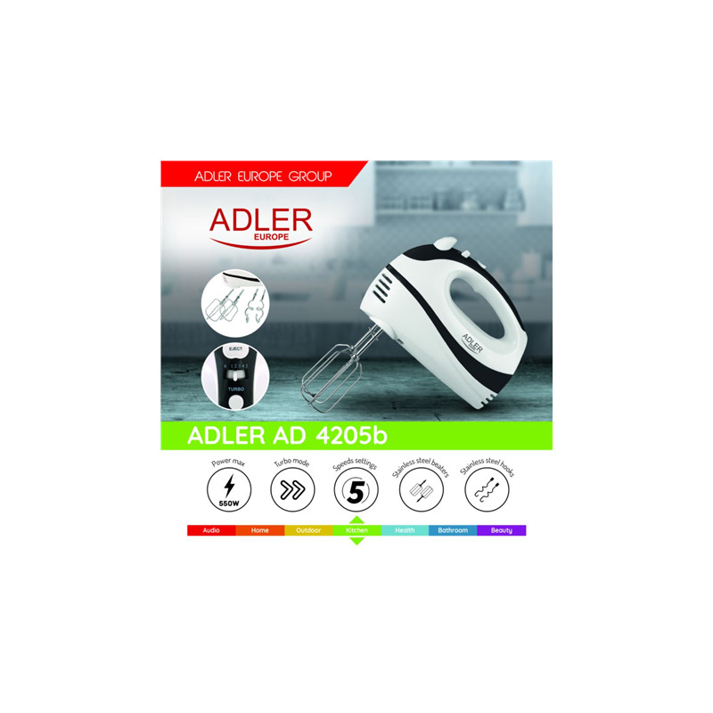 Adler | Mixer | AD 4205 b | Hand Mixer | 300 W | Number of speeds 5 | Turbo mode | White/Black