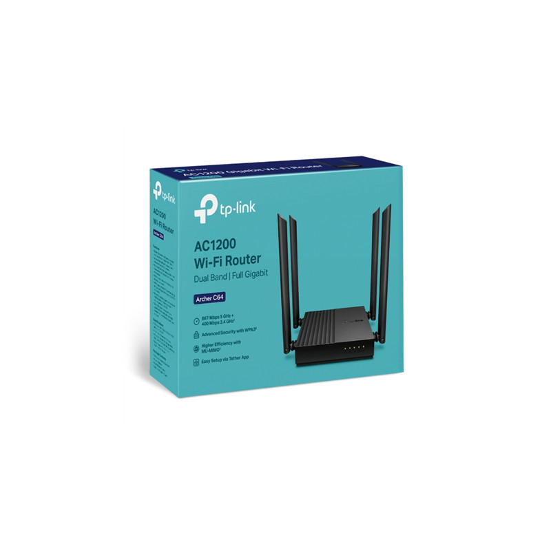 AC1200 Wireless MU-MIMO Wi-Fi Router | Archer C64 | 802.11ac | 867+400 Mbit/s | Ethernet LAN (RJ-45) ports 4 | Mesh Support No | MU-MiMO Yes | No mobile broadband | Antenna type 4 x Fixed