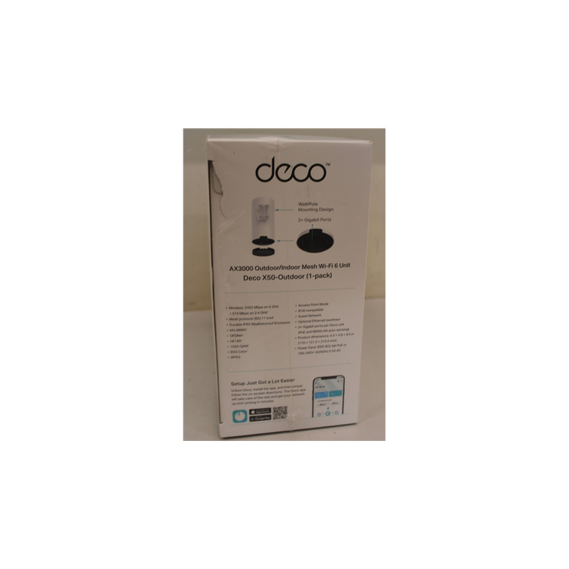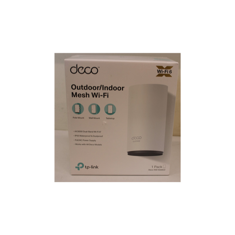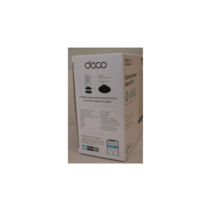 SALE OUT. TP-LINK Deco X50-Outdoor AX3000 Outdoor Whole Home Mesh WiFi 6 Unit | SALE OUT. TP-LINK AX3000 Outdoor Whole Home Mesh WiFi 6 Unit | Deco X50-Outdoor | 802.11ax | 10/100/1000 Mbit/s | Ethernet LAN (RJ-45) ports 2 | Mesh Support Yes | MU-MiMO Yes | No mobile broadband | 24 month(s) | DAMAGED PACKAGING