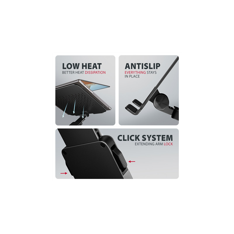 Lightweight and strong metal construction Anti-slip finish, which also protects the device from scratches Swivel arm mechanism (360 around its axis) Many adjustable positions Laptop surface tilt adjustment (0 180 ) Arm tilt adjustment (0 180 ) |