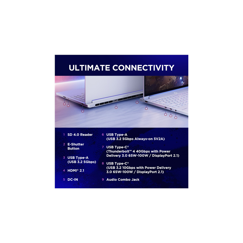 string(255) "1x USB-A (USB 5Gbps / USB 3.2 Gen 1) 1x USB-A (USB 5Gbps / USB 3.2 Gen 1), Always On 1x USB-C (USB 10Gbps / USB 3.2 Gen 2), with USB PD 65-100W and DisplayPort 2.1 1x USB-C (Thunderbolt 4 / USB4 40Gbps), with USB PD 65-100W and DisplayPort 2.1 1x HDMI 2.1"