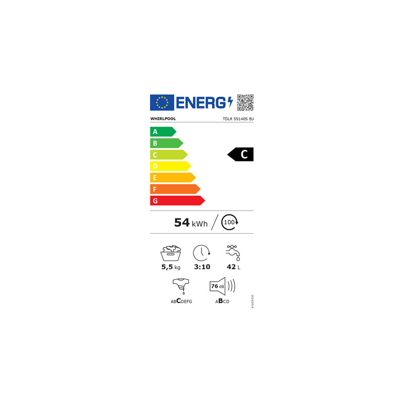 Whirlpool Washing Machine | TDLR 55140S | Energy efficiency class C | Top loading | Washing capacity 5.5 kg | 1100 RPM | Depth 60 cm | Width 40 cm | Digital | White
